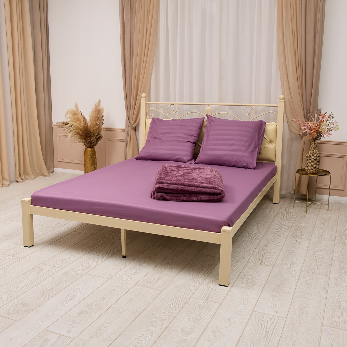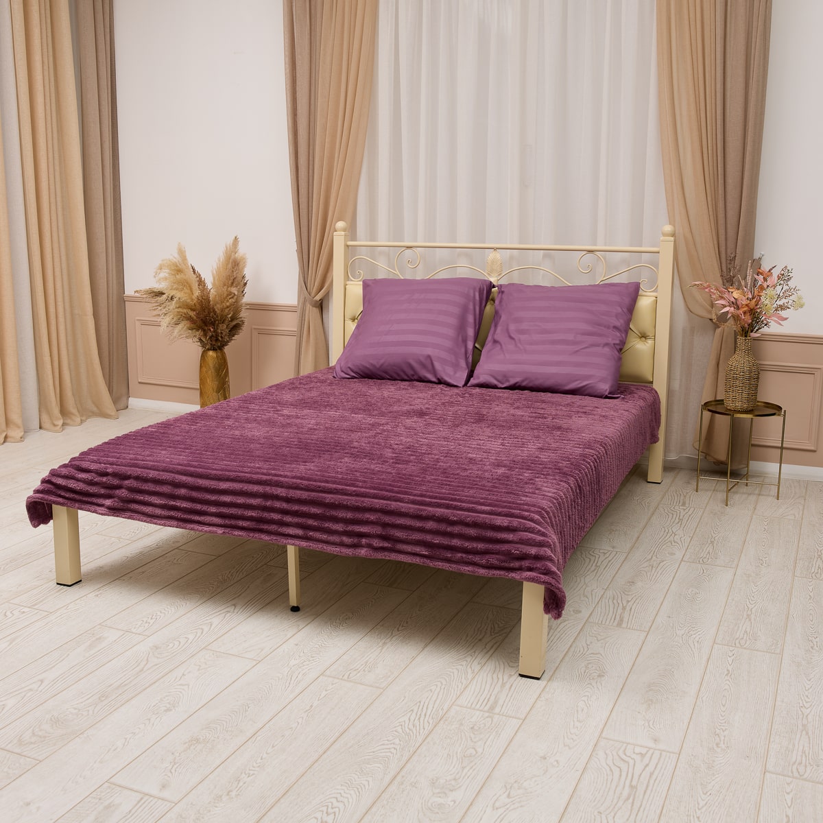 В комплект входит простыня, две наволочки (50×70 или 70×70 см), а также роскошный бархатный плед, который придаёт ещё больше тепла и изысканности. Плед можно использовать как декоративный элемент или как мягкое покрывало для прохладных вечеров.