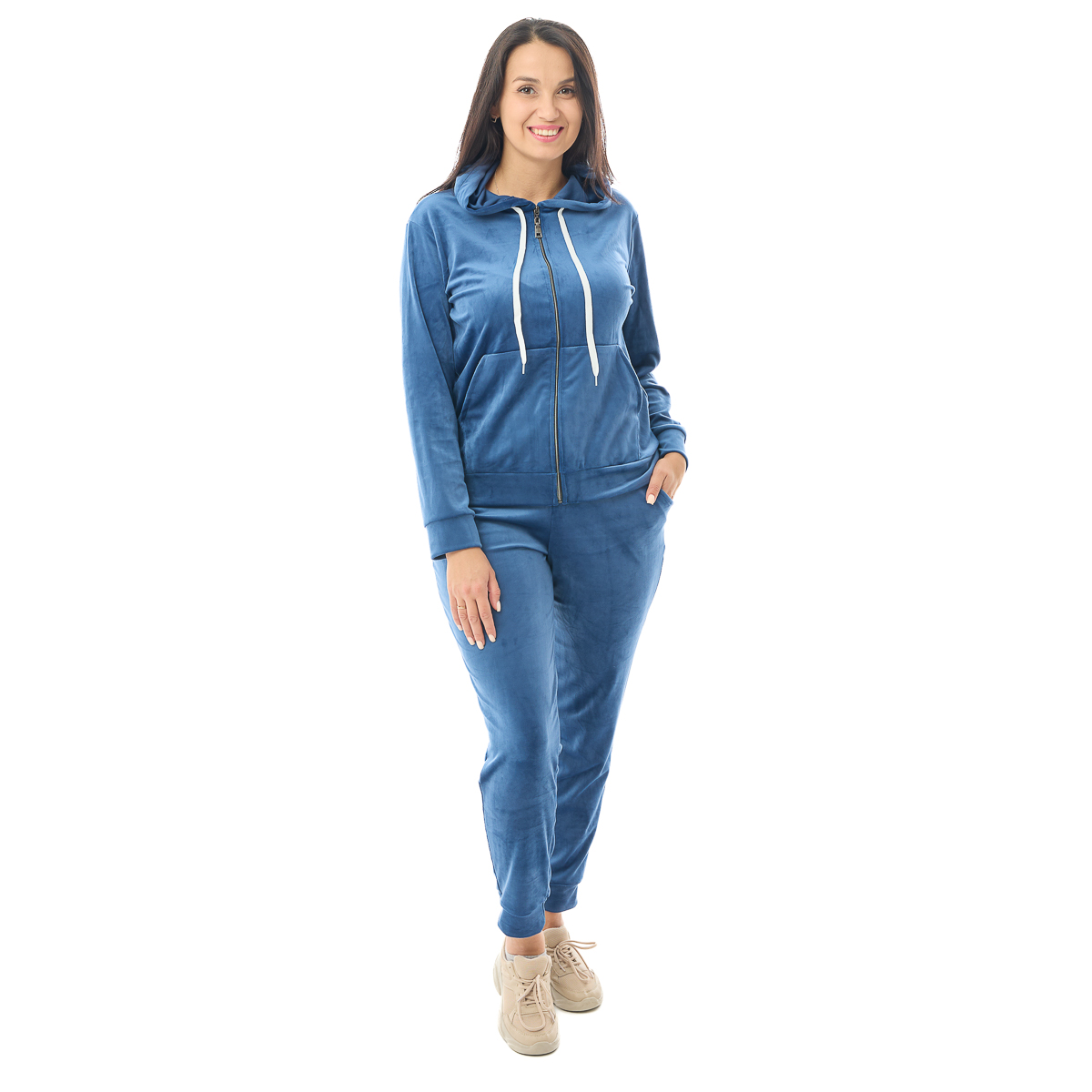 Этот костюм не только стильный, но и невероятно приятный на ощупь. Изготовлен из велюра на основе натурального хлопка, он дарит непревзойденную нежность и уют. Выдерживает многоразовые стирки без потери качества: катышки не появятся, а цвет не потускнеет.
