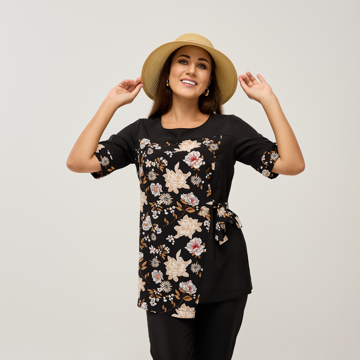 Ребекка - костюм, который мгновенно добавит изящества вашему образу! Сшит из невероятно мягкой и легкой ткани. Уникальный крой блузы подойдет для любого типа фигуры и подчеркнет ее женскую привлекательность. Цветочный рисунок добавит свежести, а укороченные, слегка облегающие брюки с карманами акцентируют внимание на изяществе ваших ног.