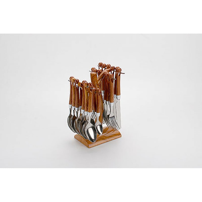 Приборы имеют удобные ручки с оригинальным узором. Прекрасное сочетание свежего дизайна и удобство использования предметов набора придется по душе каждому. Предметы набора расположены на подставке из стали с секциями для каждого вида приборов.
