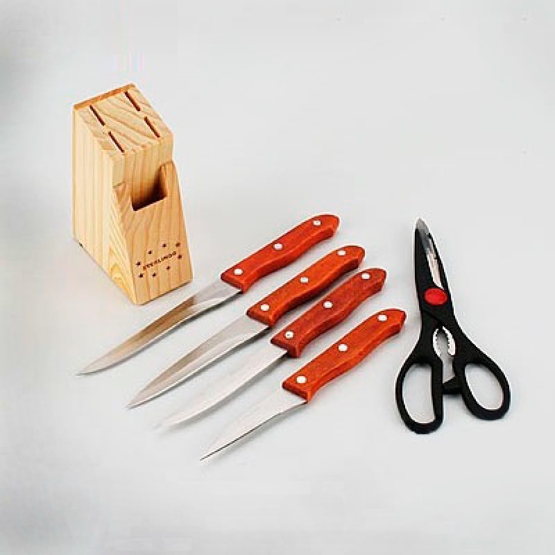 Все предметы из набора хранятся в компактной, деревянной подставке. Ножи будут стильно смотреться на любой кухне.