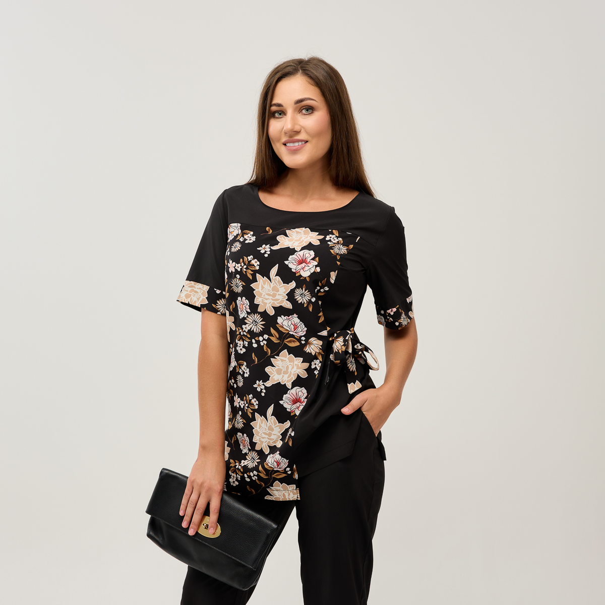 Ребекка - костюм, який миттєво додасть вишуканості вашому образу! Пошитий з неймовірно м'якої та легкої тканини. Унікальний крій блузки підійде для будь-якого типу фігури та підкреслить її жіночу привабливість. Квітковий малюнок додасть свіжості, а скорочені, легко облягаючі брюки з кишенями акцентують увагу на вишуканості ваших ніг.