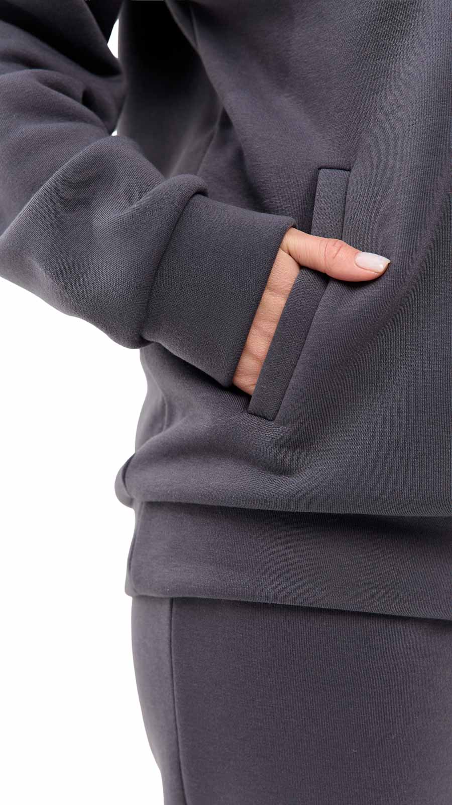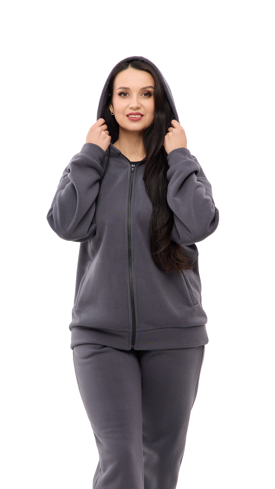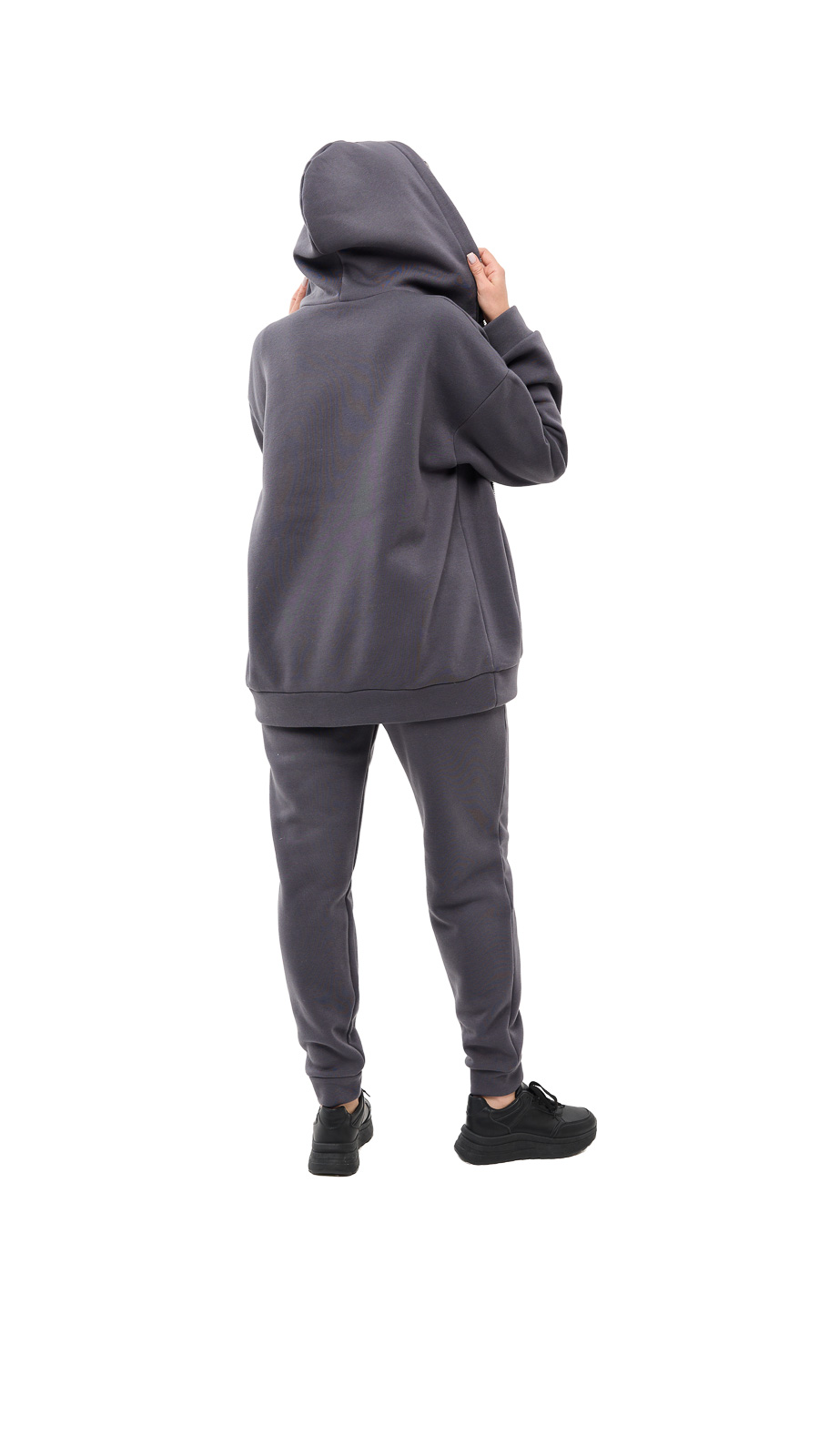 Костюм складається з кофти на блискавці з капюшоном і зручних брюк з високою посадкою.