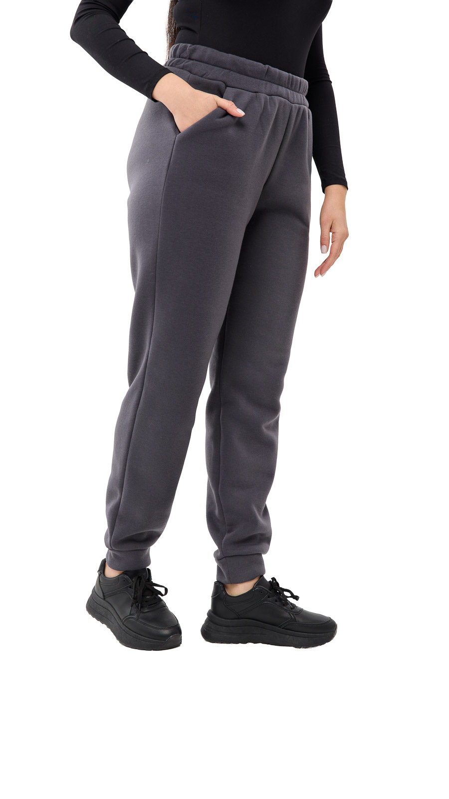 Брюки вільного крою з високою посадкою, на талії еластична резинка, зручні кишені.