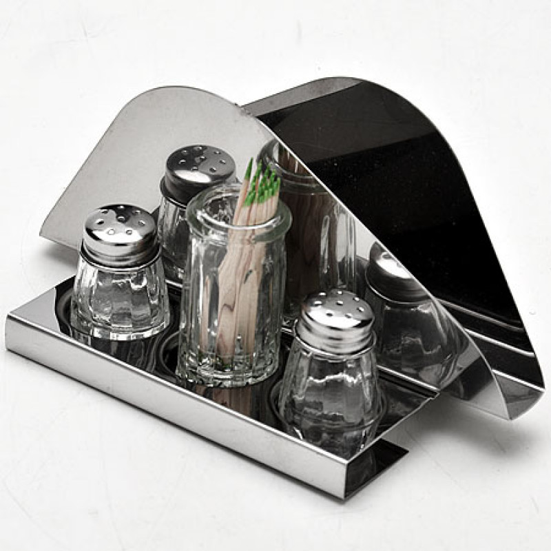 У наборі: сільничка, ємність для зубочисток, перечниця та серветниця
